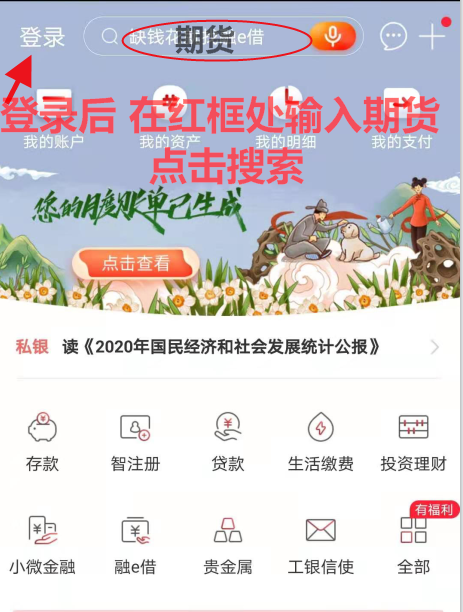 1、安裝手機(jī)銀行,并登錄,打開首頁,搜索“期貨”;